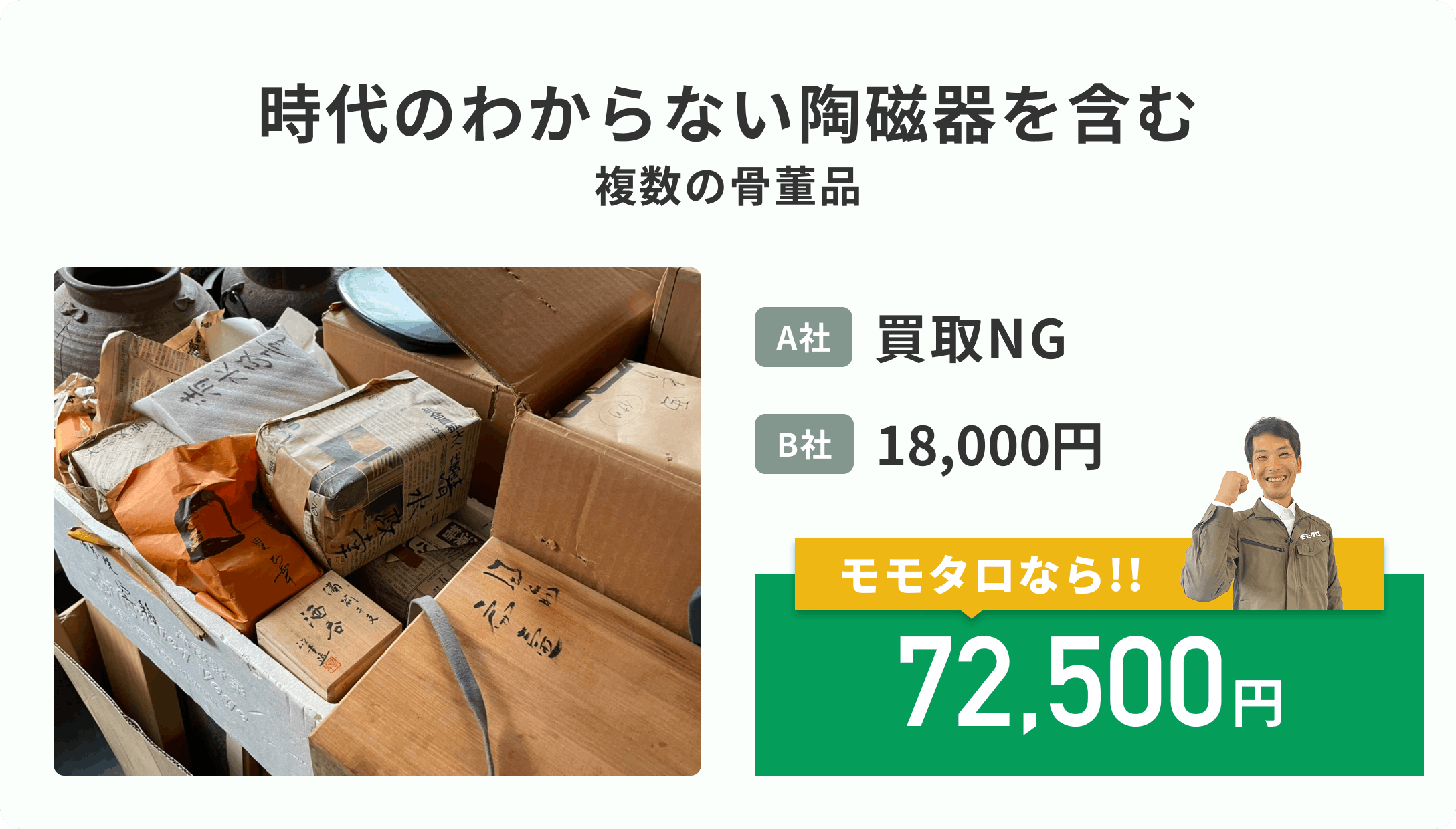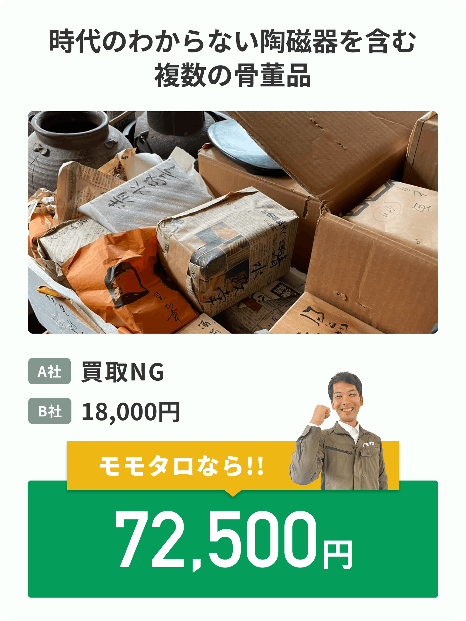 骨董品・陶磁器などは状態・年代により価格が大きく変動するため、そのままでは価値がわからないことが多くあります。そんな時は、モモタロへお任せください!モモタロでは年代不明の骨董品や金継ぎをした形跡があるもの、ヒビがや割れがあるものなど、どんな状態の商品でも査定いたします。