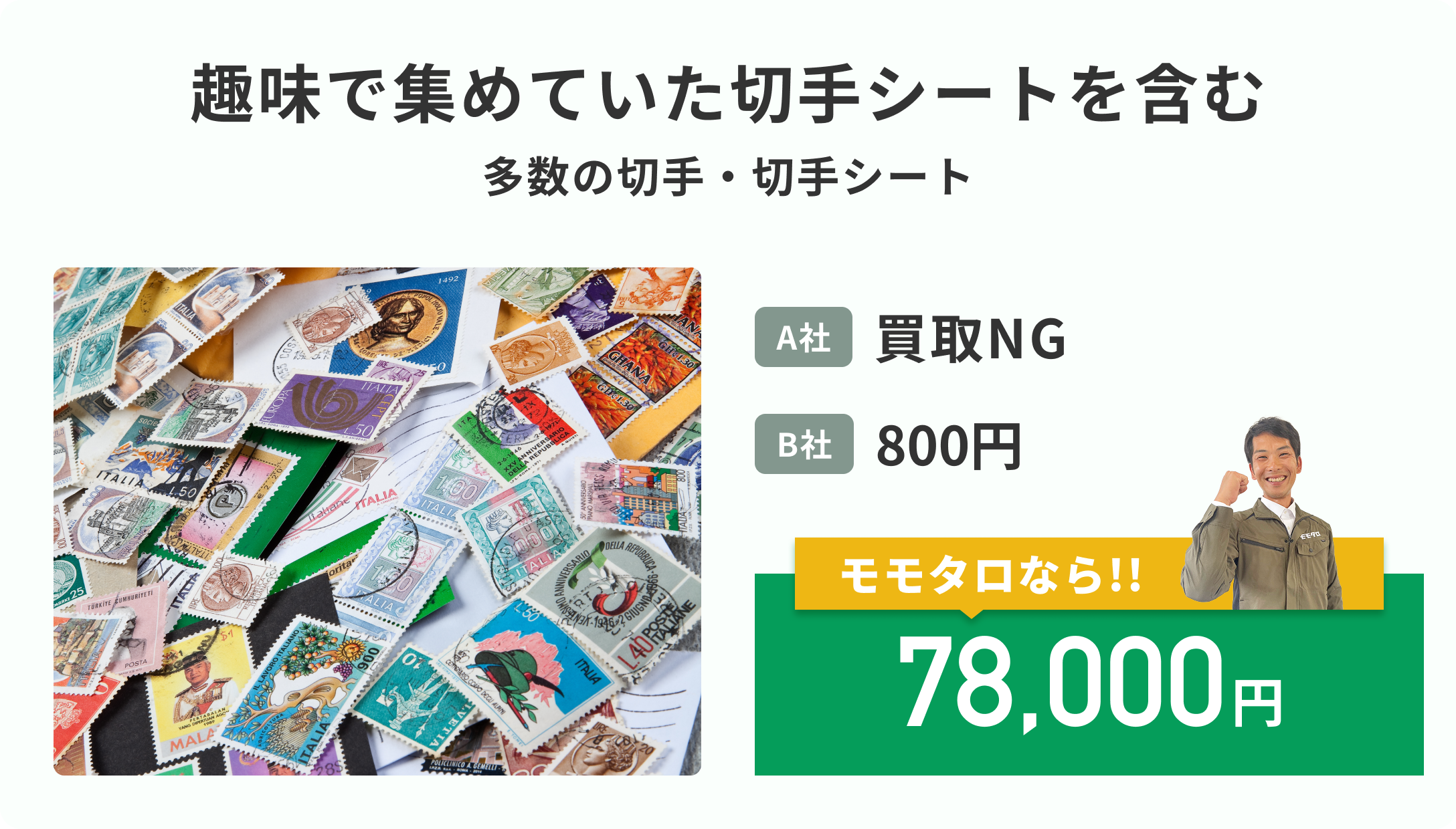 未使用のまま引き出しにしまいっぱなし切手があるなら、まるごとモモタロに買取をお任せください!未使用切手なら状態に関わらず買取価格アップの可能性がございます。