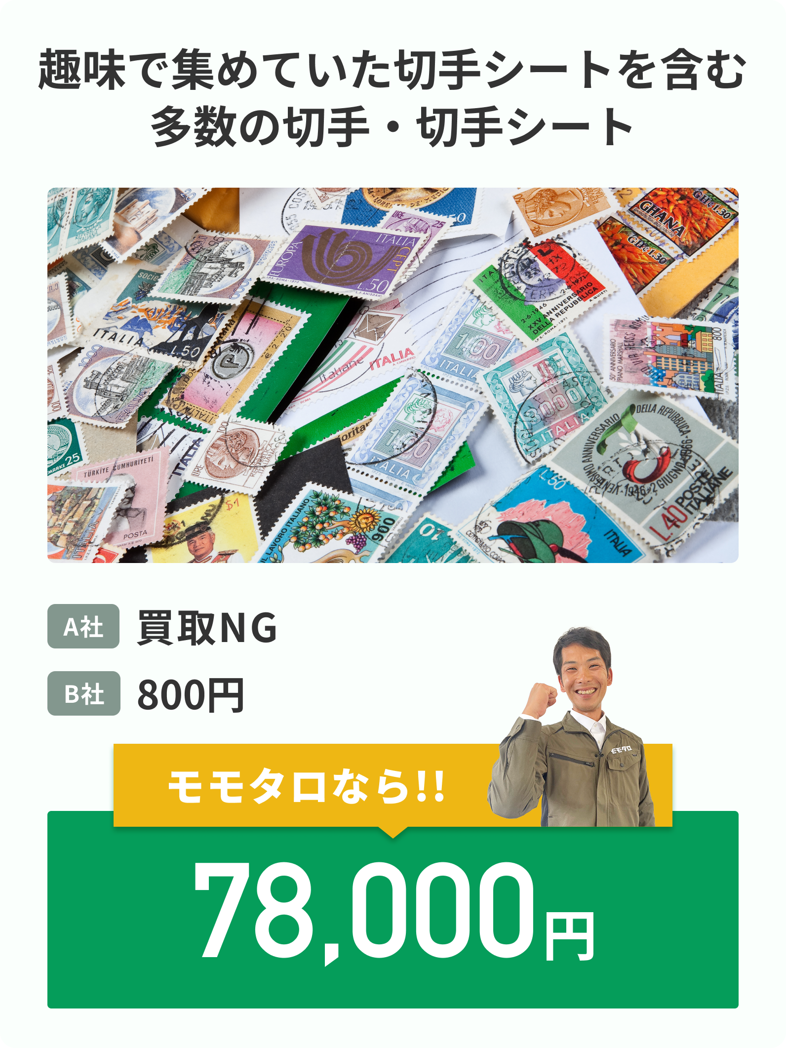 家に眠るその切手、実は高額買取可能かも!家族が収集していてアルバムになっている切手、なんだか古臭い切手など、実は高価買取対象切手の可能性大!モモタロでは様々な切手の高額査定事例が多数ございます。